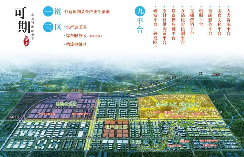 (二)規(guī)劃主要內(nèi)容。功能主要分4個區(qū):一是生產(chǎn)配套區(qū):輻照中心、檢測中心、研發(fā)中心(學術(shù)、研究院)、營銷中心(產(chǎn)品發(fā)布、結(jié)算金融)。二是生活服務區(qū)(未來之城):人才中心(院士苑、博士閣、專家樓、人才公寓)、商務中心(酒店、體驗)、服務中心(醫(yī)院、學校)、休閑中心(濕地公園、運動場)。三是生產(chǎn)加工區(qū):標準廠房、自建廠房。四是物流樞紐區(qū):冷鏈中心(倉儲、運輸)、原料中心、交易中心、電商中心。