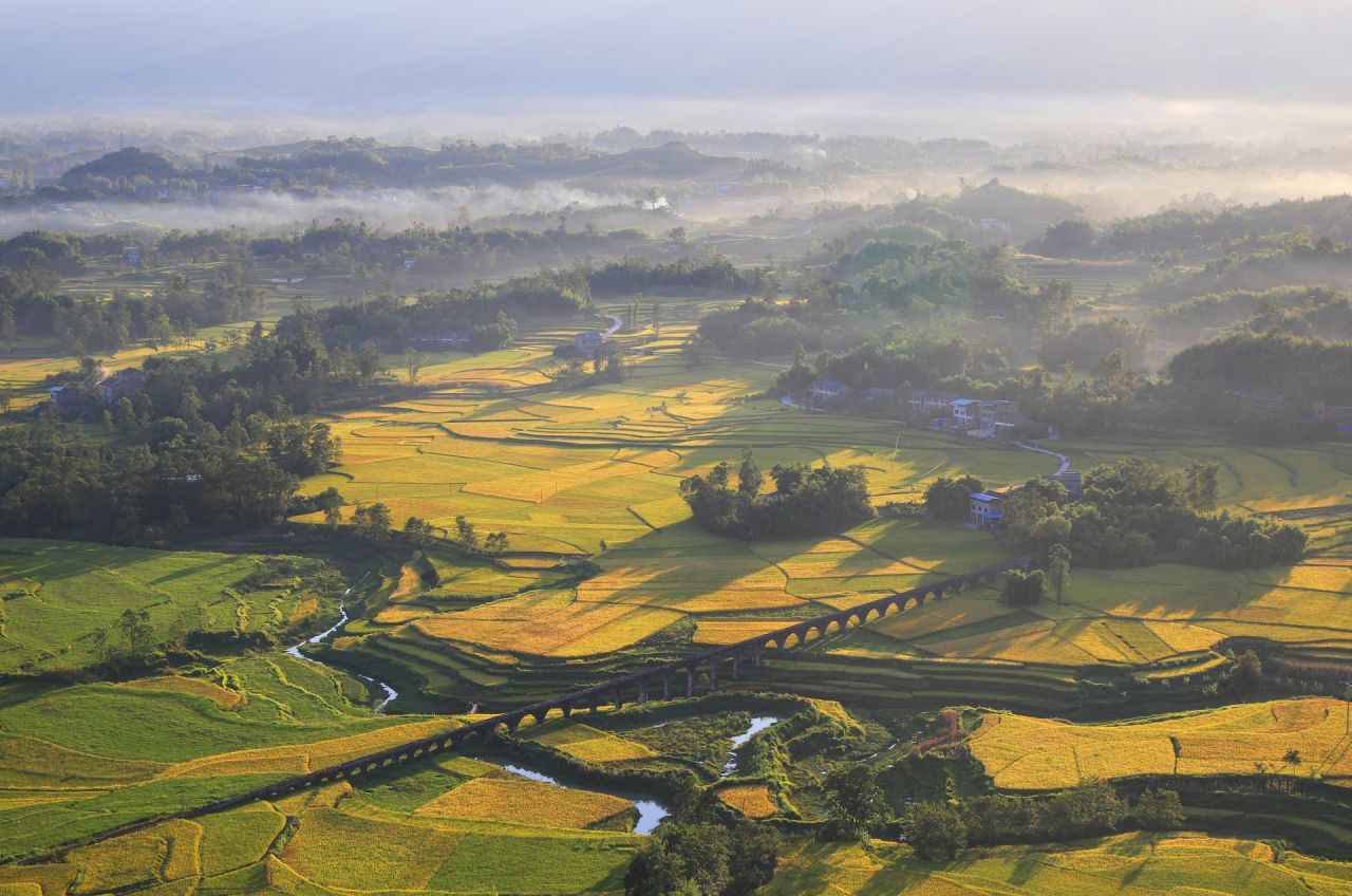 明達(dá)鎮(zhèn)紅壩村廣袤田野間翻滾千重稻浪,滿目金黃,豐收在望
